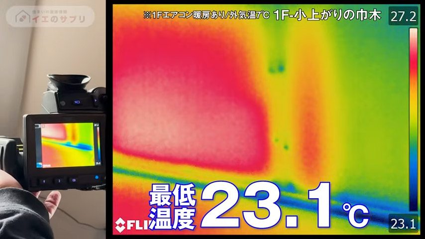 気密測定の後、熱画像カメラで確認してみたもののスキマになりやすい小上がりの巾木も最低温度で約23℃とかなり暖かいことがわかります。