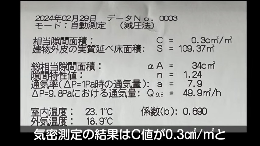 冬のお風呂場でお子さんが泣くほど寒さを感じるサウザー邸の気密性能を測定したところ、C値は0.3㎠/㎡とかなり高気密という結果が出ました。
