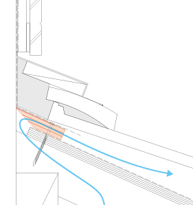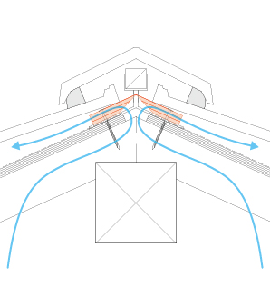 桟瓦の一番上の瓦桟として取付けられ、瓦の空間から瓦の隙間を通じて換気する瓦下取付型の棟換気材です。瓦下取付型は開口部分がもともと瓦の下にあるため、水が入りにくく防水性能に優れています。また、瓦下に設置することから瓦の形状にとらわれること無く、施工を気にせず使用できます。