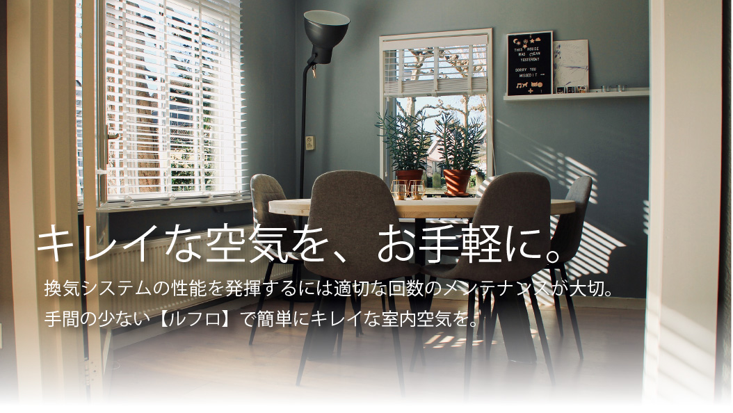 1年に1度の大掃除の時にファンを水洗いするだけ。ルフロは毎日忙しい家事の味方です。目の細かいフィルタータイプの熱交換式に比べて第3種ダクト式のルフロは換気量が落ちにくく、年1回のお手入れで無理なく換気量を維持できます。