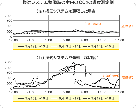 最近の住宅は、昔の住宅と比べ気密性能がよくなっています。自然換気だけでは最低限必要な換気量が不足します。特に、冷暖房期や就寝中は窓を閉めて生活することが多いので、ホルムアルデヒドなどVOCの気中濃度も高くなる傾向にあります。ですから、24時間連続運転する換気が必要になるわけです。もしも、ファンを止めてしまった場合、このグラフのように、二酸化炭素濃度も許容値を超えてしまいます。そのほか生活臭や水蒸気などが室内にこもりやすく、窓に結露が起きたり、カビ・ダニが発生しやすくなったりします。このように室内空気汚染の状況は、換気の有無に左右されます。