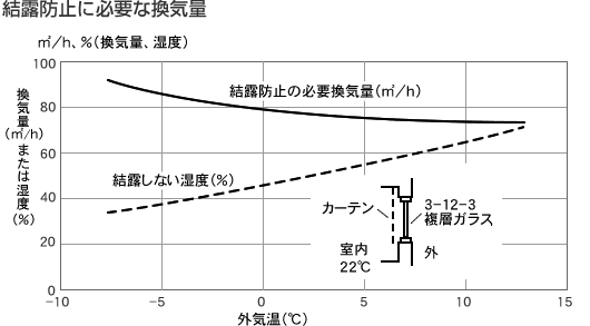 結露防止対策の一つとして、換気は住宅内の湿度を下げるため非常に有効な手段といえます。窓の結露を防ぐための換気量は右図の通り。しかし、結露の発生には室内の温湿度、外気温、窓や壁の断熱性能、暖房状況などさまざまな要因がかかわってきます。換気だけがすべてを解決するものでは無いということです。