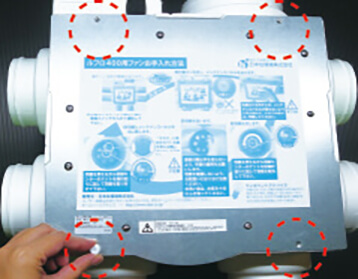 化粧ネジ4本を取外し、メンテパネルを必ず押さえながら開けます。